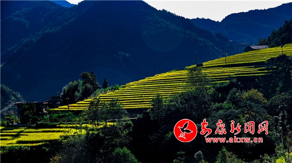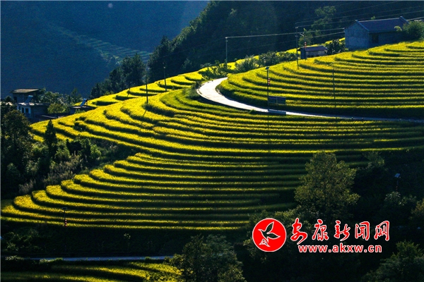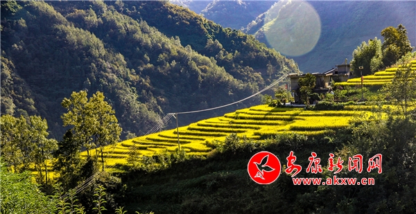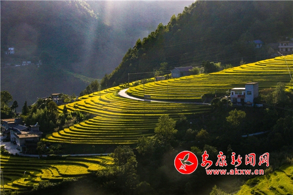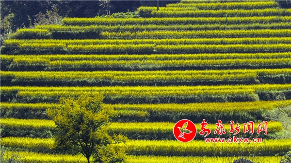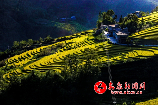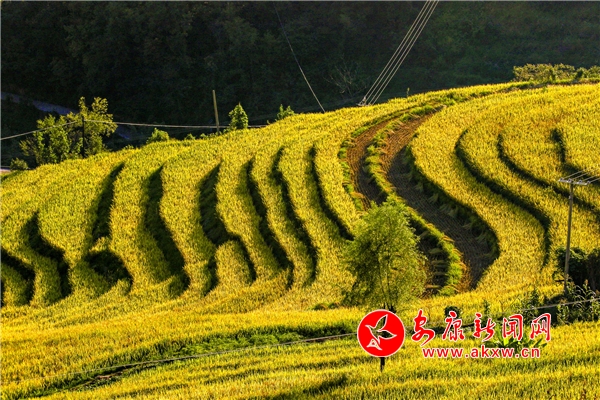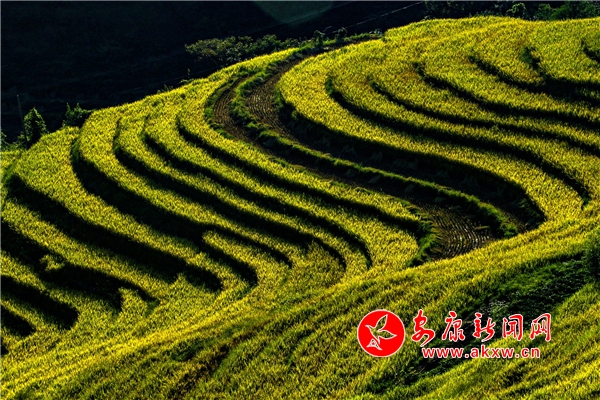 放眼望去,黃亮亮的稻谷,層層疊疊,從山底一直鋪到半山腰。水田都是依山而修,隨山形而變,高差均是隨坡放緩,形狀雖不十分規(guī)則卻也精巧,動(dòng)人之處全在自然的水平線上。