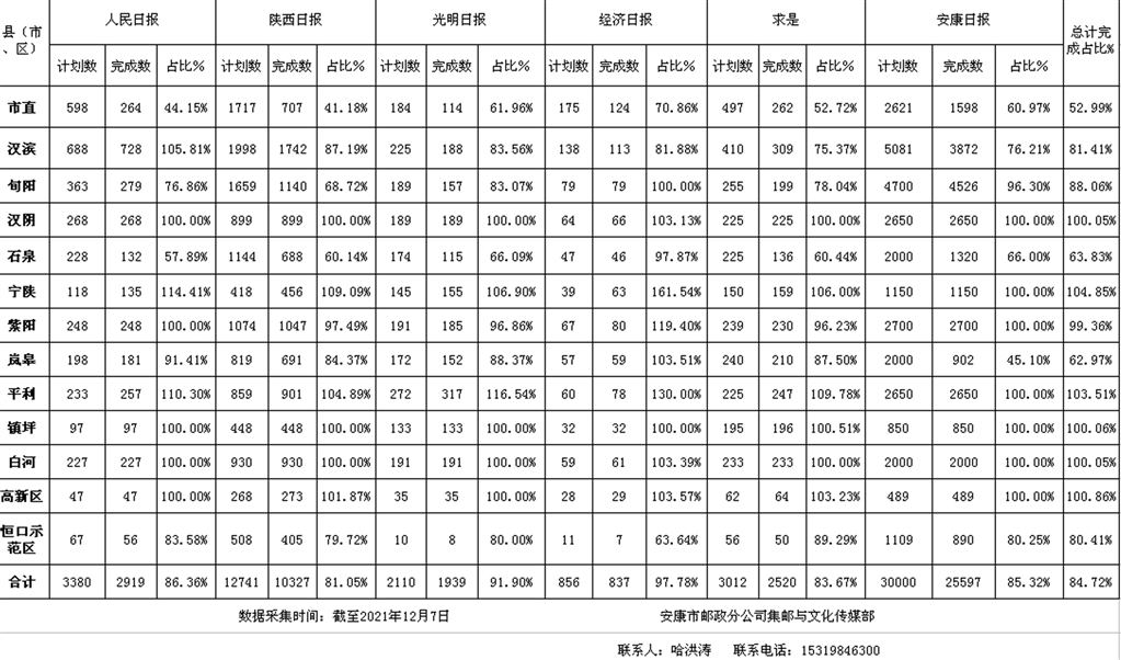截至2021年12月7日,全市重點(diǎn)黨報黨刊完成量占下達(dá)計劃數(shù)的84.72%。征訂情況為:寧陜縣104.85%,平利縣103.51%,高新區(qū)100.86%,鎮(zhèn)坪縣100.06%,漢陰縣100.05%,白河縣100.05%,紫陽縣99.36%,旬陽市88.06%,漢濱區(qū)81.41%,恒口示范區(qū)80.41%,嵐皋縣62.97%,市直各單位52.99%。其中,寧陜縣、平利縣、高新區(qū)、鎮(zhèn)坪縣、漢陰縣、白河縣,措施有力,率先完成2022年度征訂任務(wù)。