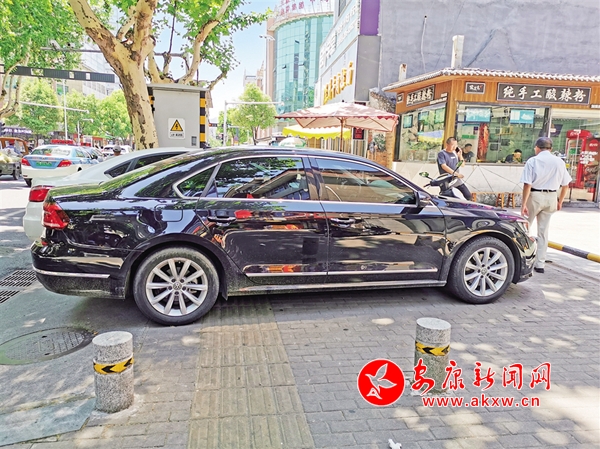 6月30日,在漢濱區(qū)鼓樓街興安中路十字,汽車、摩托車占用人行道,給行人帶來不便。(記者 潘潤(rùn)生 攝)