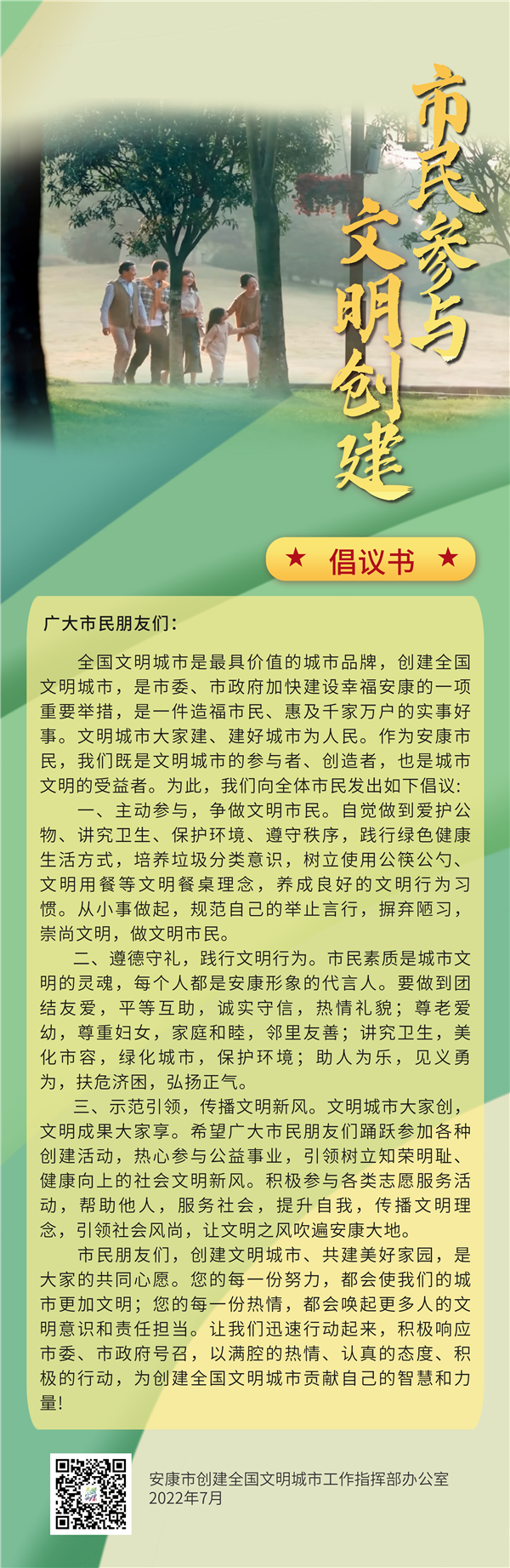 全國文明城市是最具價(jià)值的城市品牌,創(chuàng)建全國文明城市,是市委、市政府加快建設(shè)幸福安康的一項(xiàng)重要舉措,是一件造福市民、惠及千家萬戶的實(shí)事好事。文明城市大家建、建好城市為人民。作為安康市民,我們既是文明城市的參與者、創(chuàng)造者,也是城市文明的受益者。為此,我們向全體市民發(fā)出如下倡議:??