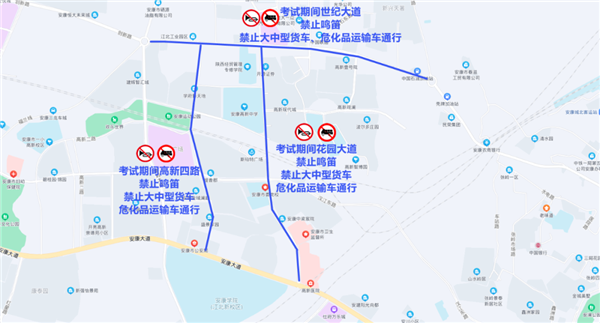 1、花園大道(安康大道至世紀(jì)大道)、世紀(jì)大道(新路口環(huán)島至五路口環(huán)島)、高新四路,所有通行車輛于6月6日21時(shí)至6月8日21時(shí),無論遇到何種情況,一律禁止鳴笛,禁止大中型貨車、危化品運(yùn)輸車通行。
