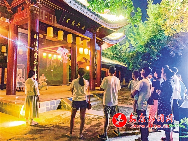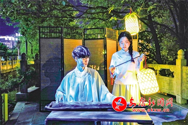 還未走近安瀾樓,就被一首琵琶曲改編的絲竹樂曲《春江花月夜》吸引,流暢多變的節(jié)奏,巧妙細(xì)膩的配器,絲絲入扣的演奏,仿佛將觀眾帶入那個月夜春江的迷人景色。環(huán)繞安瀾樓四周,畫家楊炳昌筆下的金州八景,仿佛一秒穿越古今,勝景徐徐、浮現(xiàn)腦際。