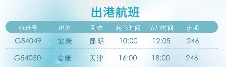 12月26日起,安康富強(qiáng)機(jī)場(chǎng)新增“安康=昆明”“安康=天津”航線(xiàn)。具體航線(xiàn)航班如圖: