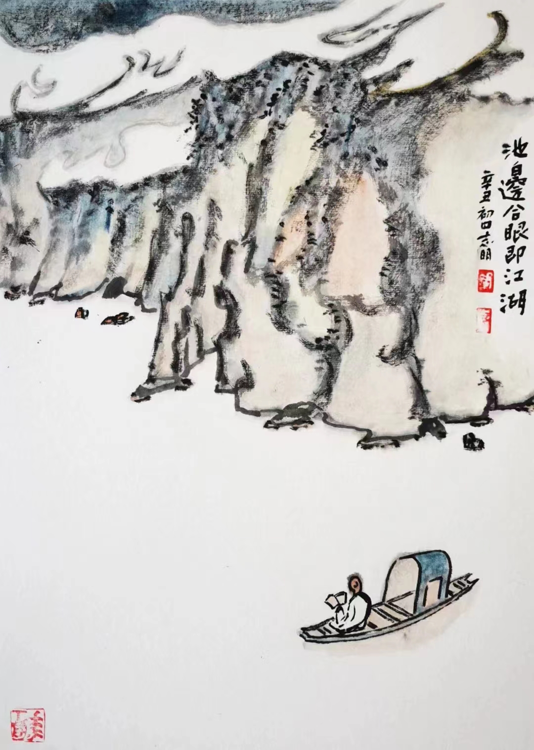 記得那一年的端午節(jié),鞏志明發(fā)來短信,是他寫的一首詩:綠粽黃酒聚江邊,白帆紅燭祭屈原。三千清淚流不得,九萬渾念飄上天。誰有郁悶誰散淡,何謂圓滑何忠奸。十丈風(fēng)塵古今在,談笑真?zhèn)位聼煛?017年,我遷新居,鞏老師為我寄來小品畫《福到眼前》,我很喜歡,并懸掛至新居玄關(guān)。這些年,鞏志明老師常做影展畫展策劃及影評(píng)講座,自已也臨池不輟,水墨丹青,寄情抒懷,他的文人小品有思想性、有創(chuàng)造性。雖畫的是松風(fēng)明月,小舟流水或遠(yuǎn)古人物,但都寄托了他當(dāng)下的心境,以消塊壘。誠如有人評(píng)論他為“吾師真文人,畫亦真性情!”他不僅只是身居畫室的怡情文人,他亦是心憂天下的豪俠。面對(duì)世間不平事,他也是激揚(yáng)文字,揮斥方遒!在功利的當(dāng)下,鞏志明尤其顯得難能可貴!?