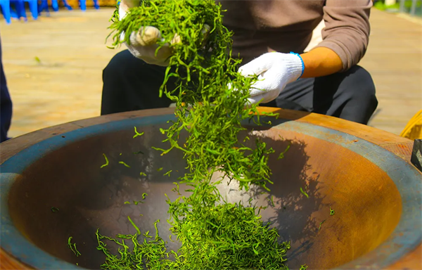 翠屏島瀛湖茶舍,我們推出了圍爐煮茶項(xiàng)目,炒茶師傅現(xiàn)場殺青、揉捻、干燥,隨后將瀛湖的明前茶呈送到游客面前。當(dāng)然,游客若有興趣,也可親自實(shí)操這難能可貴的體驗(yàn)。
