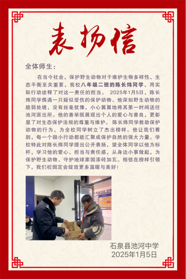 陳長煒的暖心事跡傳到學(xué)校后,學(xué)校發(fā)布了表揚(yáng)信,公開表揚(yáng)陳長煒同學(xué)的愛心善舉和保護(hù)野生動(dòng)物的暖心行為。號(hào)召全體學(xué)生要學(xué)習(xí)陳長煒的愛心、責(zé)任和擔(dān)當(dāng),從小事做起,從自身做起,保護(hù)野生動(dòng)植物,為保護(hù)地球家園、尊重生態(tài)文明的多樣性貢獻(xiàn)力量。?