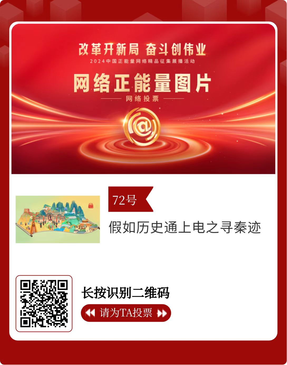 陜西省32件作品進(jìn)入投票環(huán)節(jié),投票時(shí)間為2月15日至2月21日,投票結(jié)果將作為中國(guó)正能量網(wǎng)絡(luò)精品遴選的重要參考。中國(guó)正能量網(wǎng)絡(luò)精品,期待每一個(gè)充滿正能量的你投出點(diǎn)贊一票。