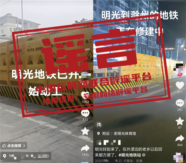 真相:近日,網(wǎng)民“張**”“沙**”等發(fā)布視頻,編造并傳播“明光地鐵已開始動工”相關(guān)虛假信息,并配以誤導(dǎo)性視頻,引發(fā)關(guān)注和討論。經(jīng)核實,相關(guān)視頻內(nèi)容對應(yīng)區(qū)域施工項目并非修建地鐵,網(wǎng)傳視頻系謠言。明光市委網(wǎng)信辦和市公安局已依法對張某、沙某等進行批評教育,并要求其刪除相關(guān)不實信息。(來源:“安徽省互聯(lián)網(wǎng)違法和不良信息舉報”微信公眾號、明光市委網(wǎng)信辦)