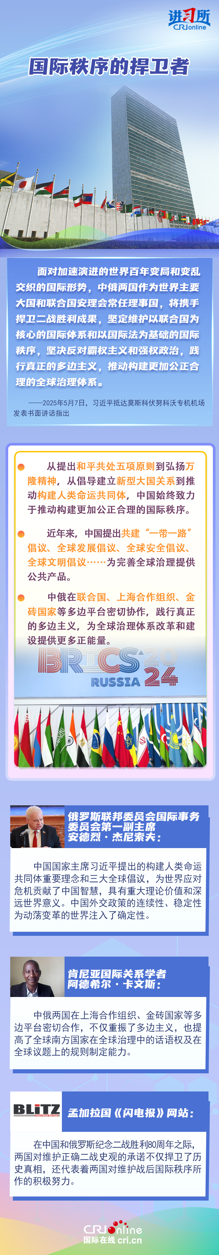 “兩國人民用鮮血和生命凝結(jié)的深厚情誼,如黃河之水奔騰不息,似伏爾加河寬廣深沉,成為中俄世代友好的不竭源泉?!苯衲晔侵袊嗣窨谷諔?zhàn)爭、蘇聯(lián)偉大衛(wèi)國戰(zhàn)爭暨世界反法西斯戰(zhàn)爭勝利80周年,也是聯(lián)合國成立80周年。在這一重要歷史時間節(jié)點,習(xí)近平主席此訪不僅為中俄關(guān)系發(fā)展注入強勁動力,也向世界宣示中俄兩國攜手捍衛(wèi)二戰(zhàn)勝利成果的堅定意志。