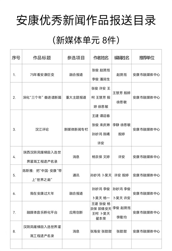 根據(jù)《關(guān)于開展2024年度安康優(yōu)秀新聞作品、安康市優(yōu)秀新聞工作者推選工作的通知》(安記協(xié)〔2025〕04號(hào))文件要求,經(jīng)推薦、領(lǐng)導(dǎo)審核,安康市融媒體中心推薦參評(píng)2024年度安康優(yōu)秀新聞作品97件(報(bào)紙單元58件,廣播電視單元31件,新媒體單元8件)?,F(xiàn)將報(bào)送作品目錄(詳見附件)予以公示。