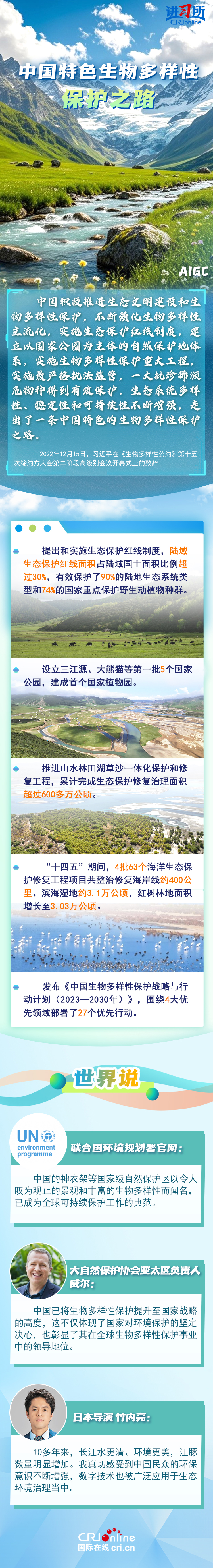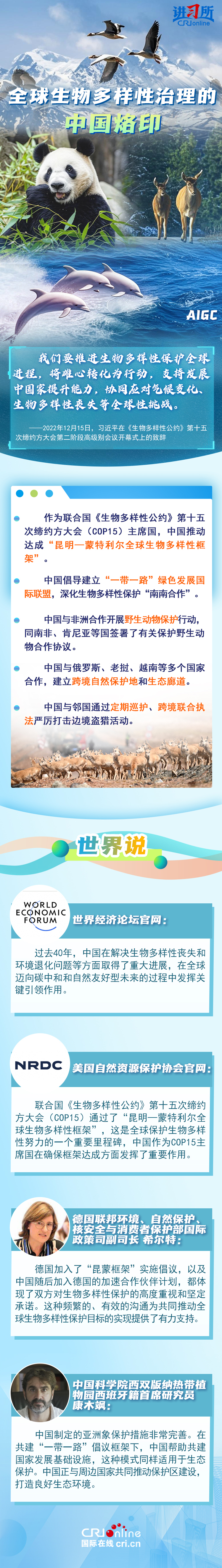 “心往一處想、勁往一處使,共建地球生命共同體?!弊鳛樽钤绾炇稹⑴鷾?zhǔn)《生物多樣性公約》的締約方之一,生物多樣性保護(hù)已經(jīng)上升為中國的國家發(fā)展戰(zhàn)略。國際人士表示,中國的一系列舉措體現(xiàn)出對生態(tài)環(huán)境保護(hù)的堅定決心,同時,中國依托共建“一帶一路”倡議等國際合作機(jī)制,為推動全球生物多樣性保護(hù)提供了有力支持,在邁向自然友好型未來的過程中發(fā)揮關(guān)鍵的引領(lǐng)作用。