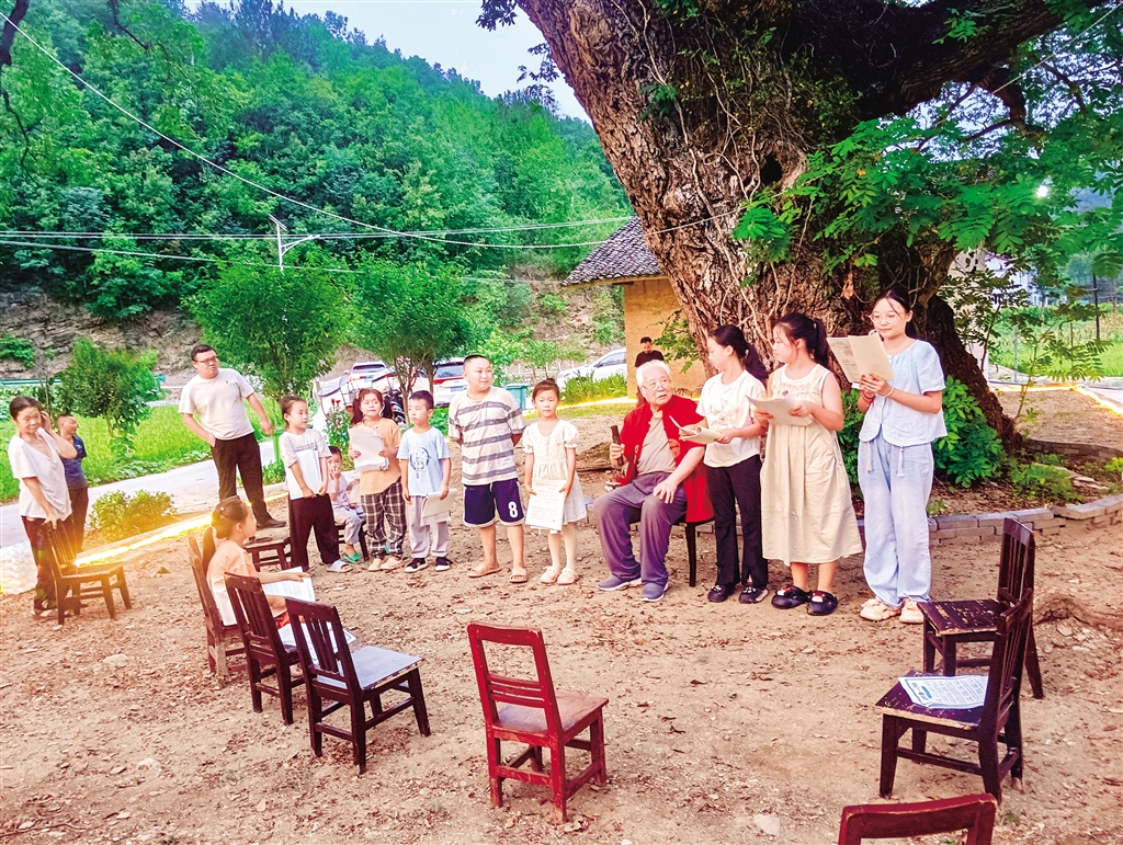 韓海燕(右四)在西河鎮(zhèn)磨溝村的古樹下給孩子們傳授國學(xué)知識(shí)