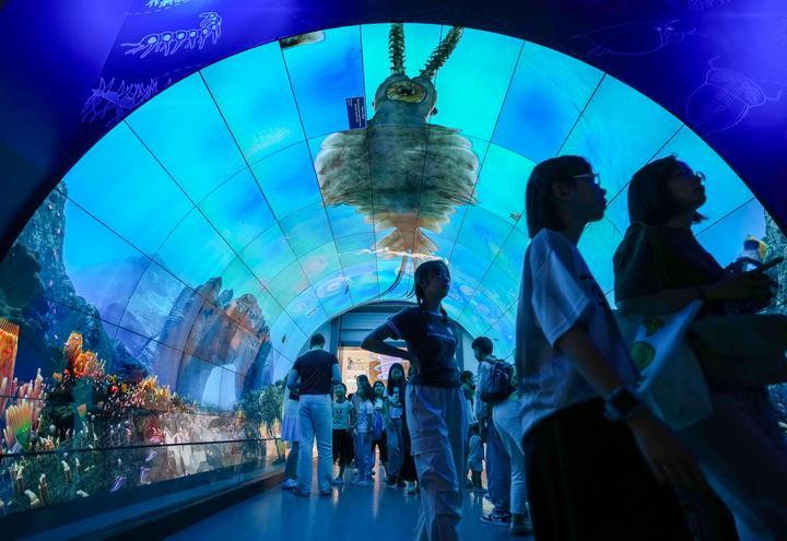 025年7月15日,游客在玉溪市澄江化石地世界自然遺產(chǎn)博物館“寒武紀(jì)海底隧道”參觀。