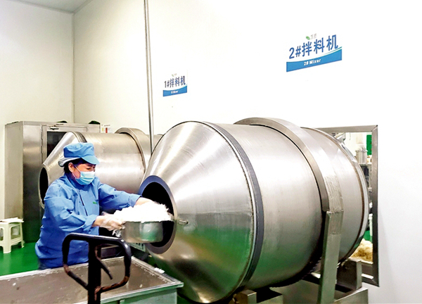 魔芋制品企業(yè)調(diào)味師將產(chǎn)品裝入攪拌機(jī)