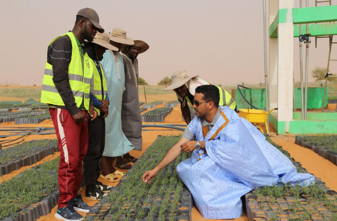 2025年5月22日,在毛里塔尼亞西部特拉扎區(qū)比爾·巴爾卡村,中非綠色技術公園毛里塔尼亞示范項目毛方協(xié)調員圖拉德·邁杜向工人傳授固沙植物種植技術。新華社記者 司源 攝