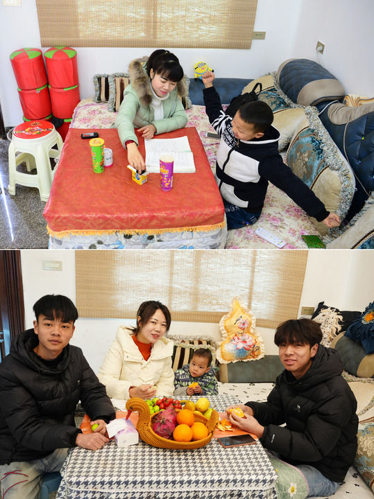 拼版照片:上圖為安康市紫陽縣蒿坪鎮(zhèn)黃金村村民雷潔(左)在易地搬遷后的新家中給大兒子張明澤輔導(dǎo)功課(2017年2月9日攝);下圖為雷潔(左二)和她的大兒子張明澤(右一)、二兒子張明懿(左一)、小兒子張翰瑞(右二)在同一地點合影(2026年1月30日攝)。