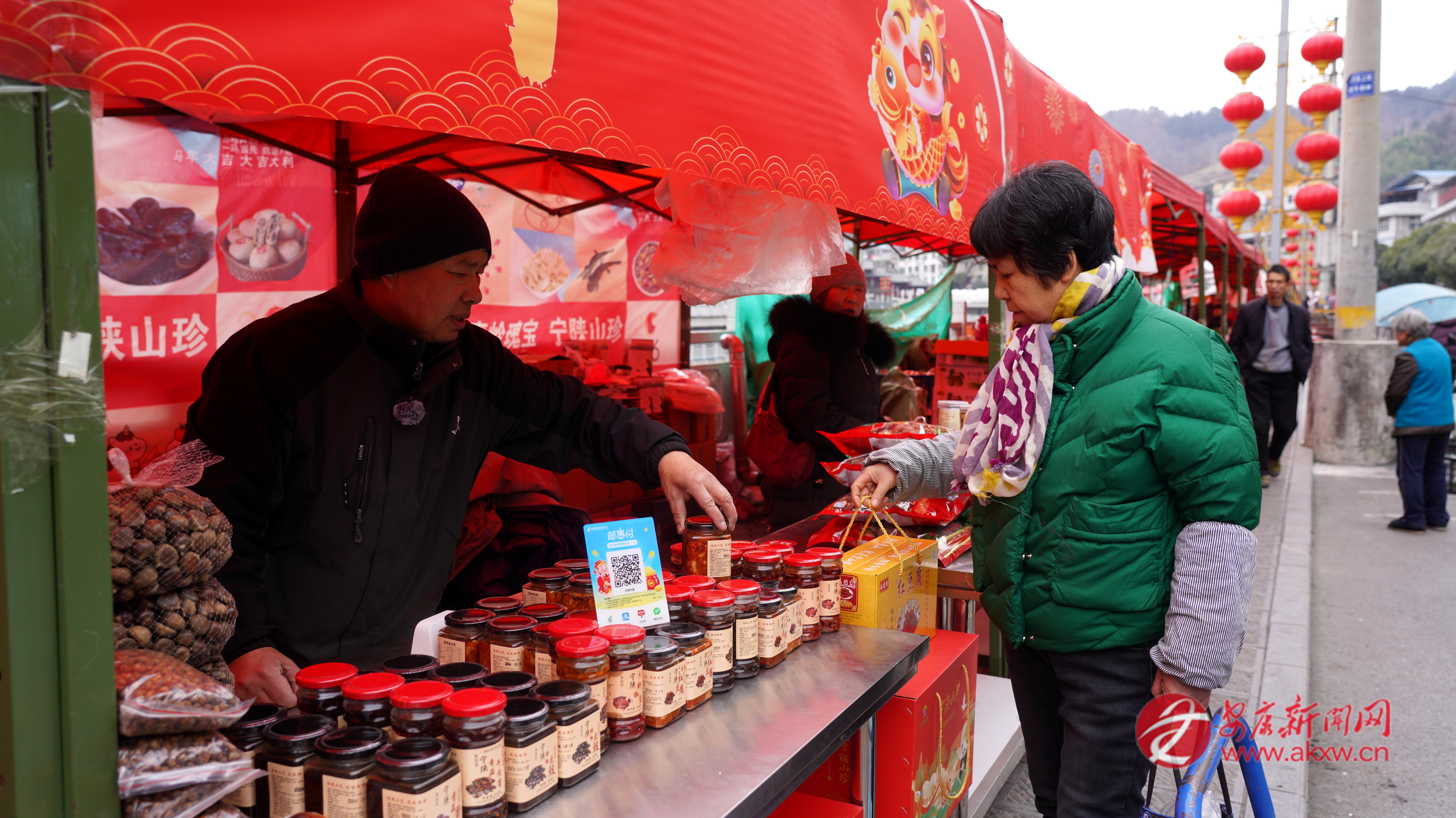 在寧陜縣城河堤東街的“年貨大集”,134個攤位整齊排布,本地臘肉油亮誘人、野生香菇厚實飽滿、土蜂蜜晶瑩剔透、木耳如墨玉般堆疊;新衣、玩具、春聯(lián)、中國結琳瑯滿目,一片喜慶祥和的景象。