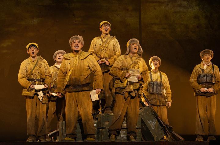 這是音樂劇《尋找李二狗》的演出劇照(2025年4月7日攝)。該劇以抗美援朝偉大歷史為背景,取材自志愿軍第39軍116師真實故事,通過當代青年常衛(wèi)國借助爺爺?shù)幕貞涗洿┰交?950年鴨綠江畔的舞臺設定,展開兩代青年的跨時空對話。2025年11月,該劇榮獲第十八屆文華劇目獎。