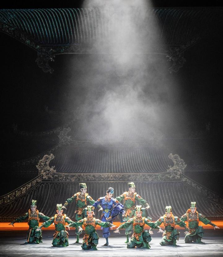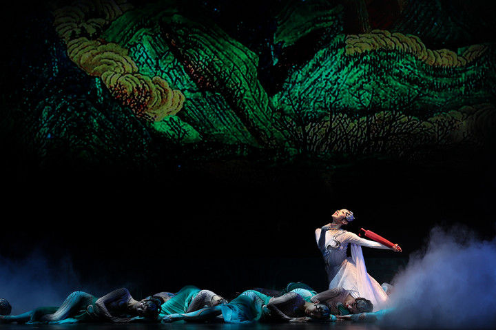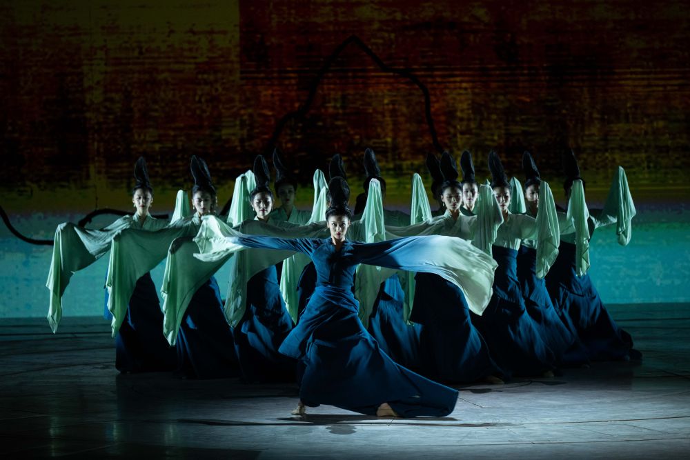 這是舞蹈詩劇《只此青綠》的演出劇照(2024年7月18日攝)。《只此青綠》采用平行空間的敘事方式,從故宮博物院青年研究員的“展卷人”視角出發(fā),講述北宋著名畫家王希孟創(chuàng)作《千里江山圖》的故事。該劇連續(xù)3年穩(wěn)居中國舞劇票房榜首,全國巡演超800場,赴多個國家和地區(qū)演出50余場,成為傳統(tǒng)文化創(chuàng)新表達、中國藝術(shù)國際表達的典范之作。