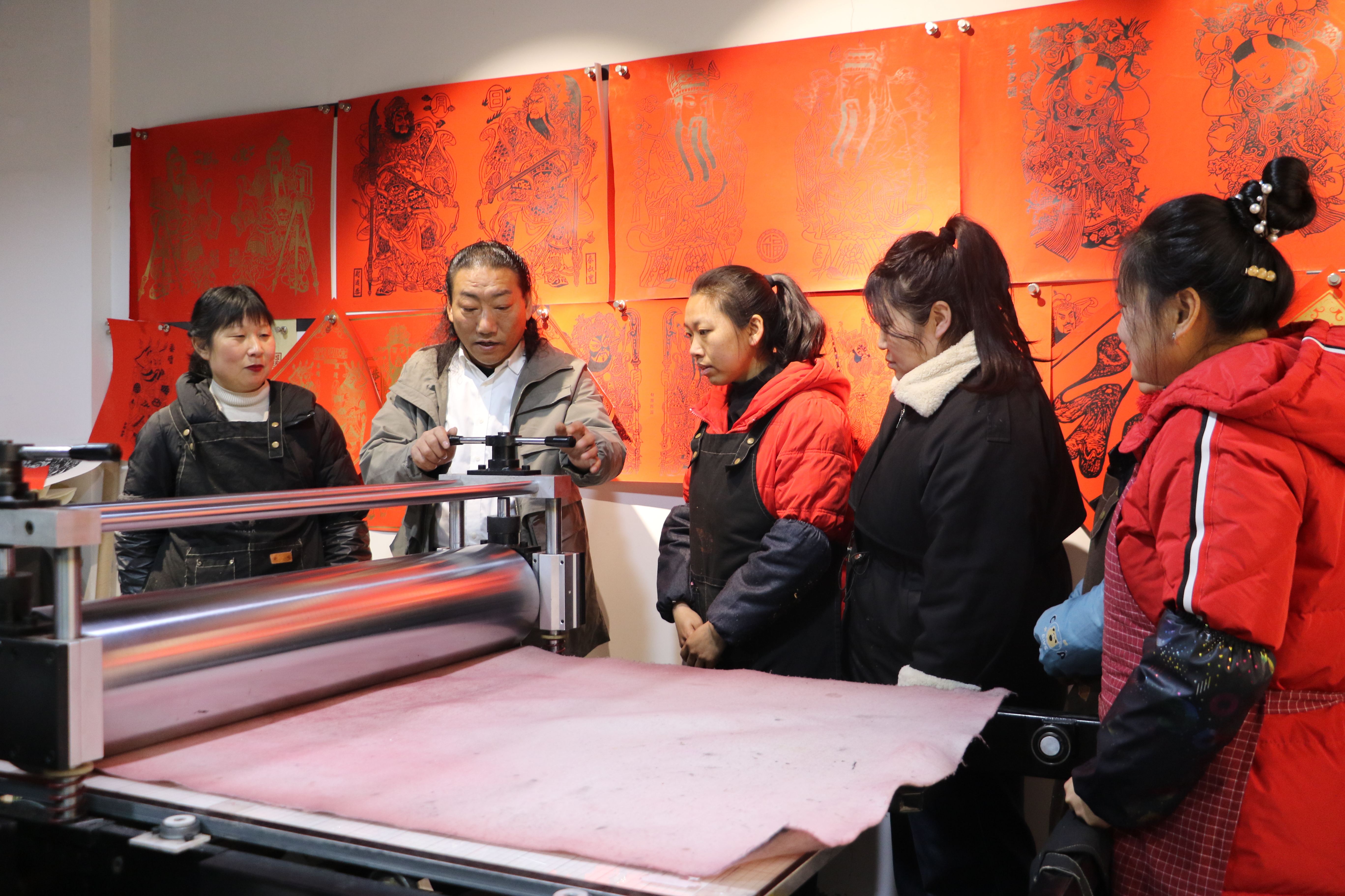 農(nóng)歷馬年春節(jié)前夕,在版畫院,一張張年畫整齊攤晾在貨架上,有明清紋樣的紅底金漆財神像,也有“馬上”成功的文創(chuàng)系列。雕版、刷色、拓印、攤晾、包裝、發(fā)貨……肖昌雙和姐妹們里里外外忙成一團。