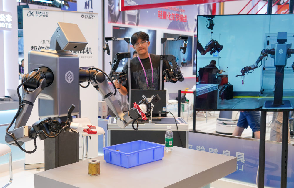 2025年10月16日,工作人員在第138屆廣交會科大訊飛展臺操作機(jī)器人拿取物品。新華社記者 肖恩楠 攝