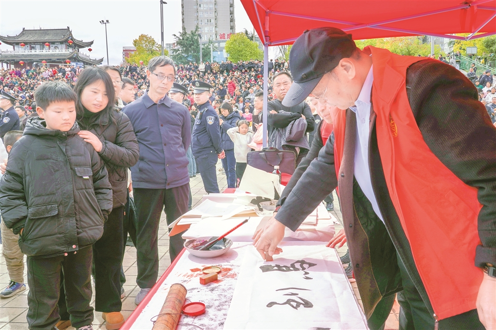 市集不僅有宣傳與服務(wù),更有可看可學(xué)的文明實(shí)踐。活動(dòng)通過宣傳展板集中展示漢濱區(qū)移風(fēng)易俗成果與文明新風(fēng)先進(jìn)典型事跡,用身邊人、身邊事帶動(dòng)群眾。非遺代表性傳承人現(xiàn)場(chǎng)詮釋勤儉美德,書法愛好者現(xiàn)場(chǎng)書寫福字與家訓(xùn),讓群眾在傳統(tǒng)文化熏陶中,潛移默化地接受新風(fēng)教育?!胺沁z、書法和移風(fēng)易俗結(jié)合得好,孩子也能受教育?!睅е⒆庸涫屑氖忻窭钆渴斋@滿滿、笑意盈盈。