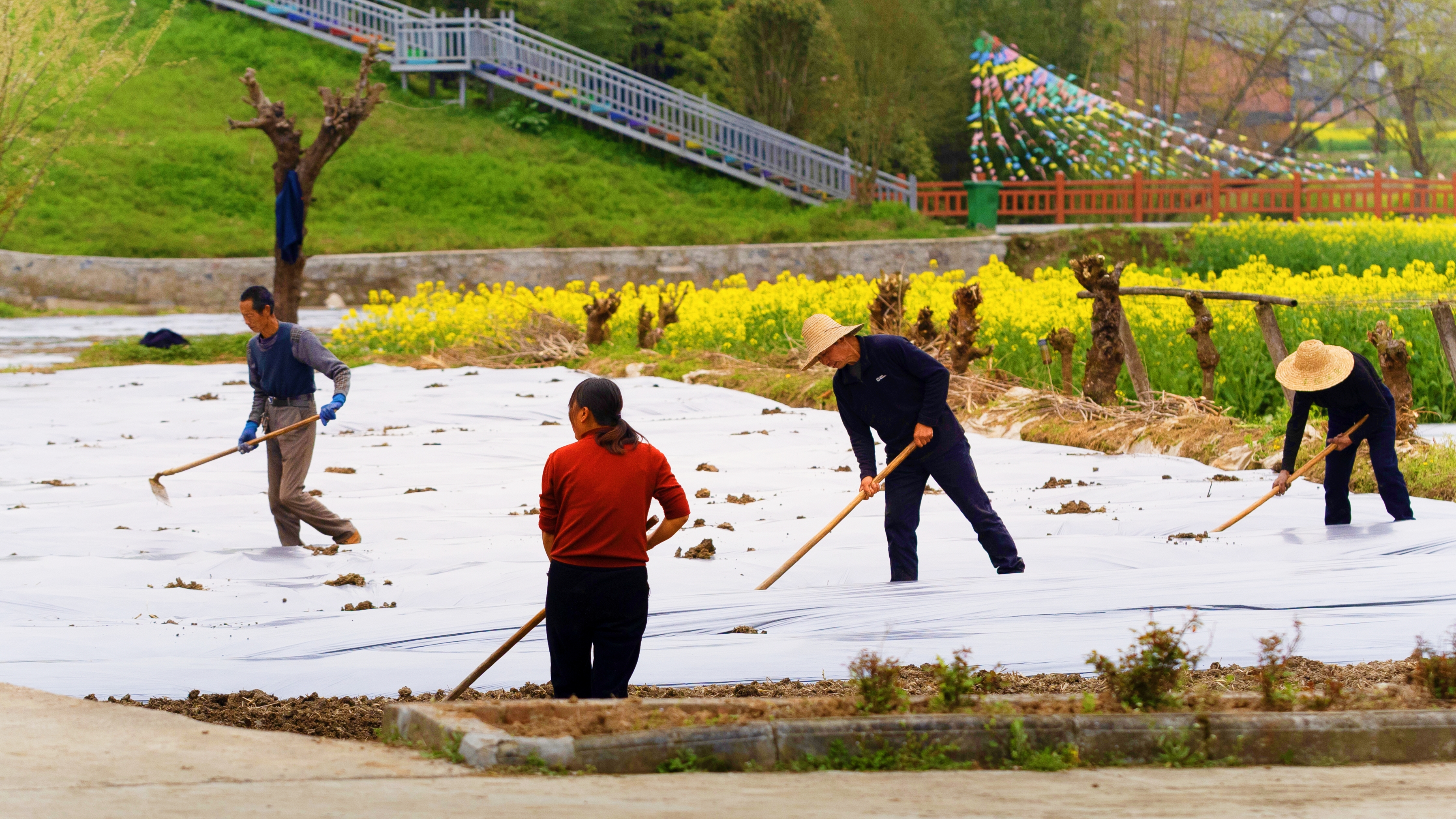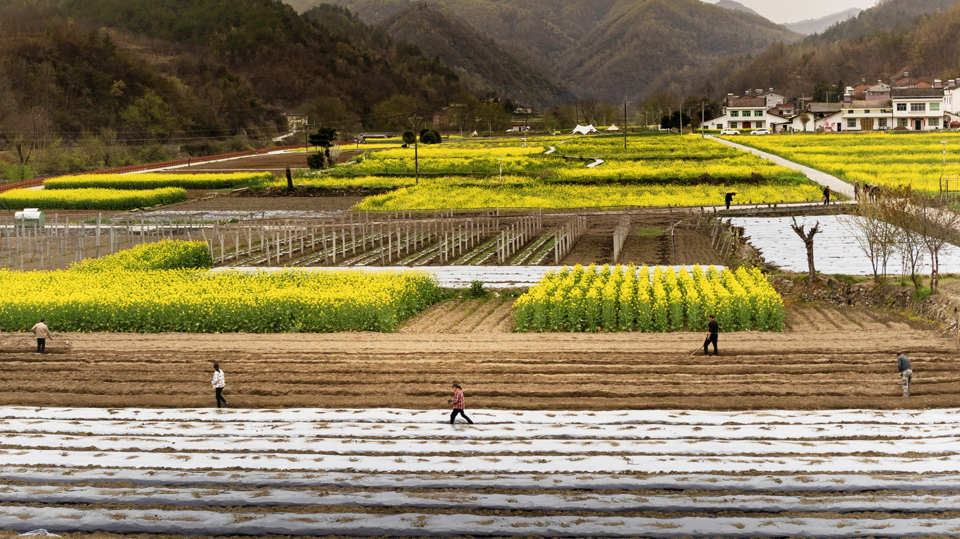 花海春耕兩相映