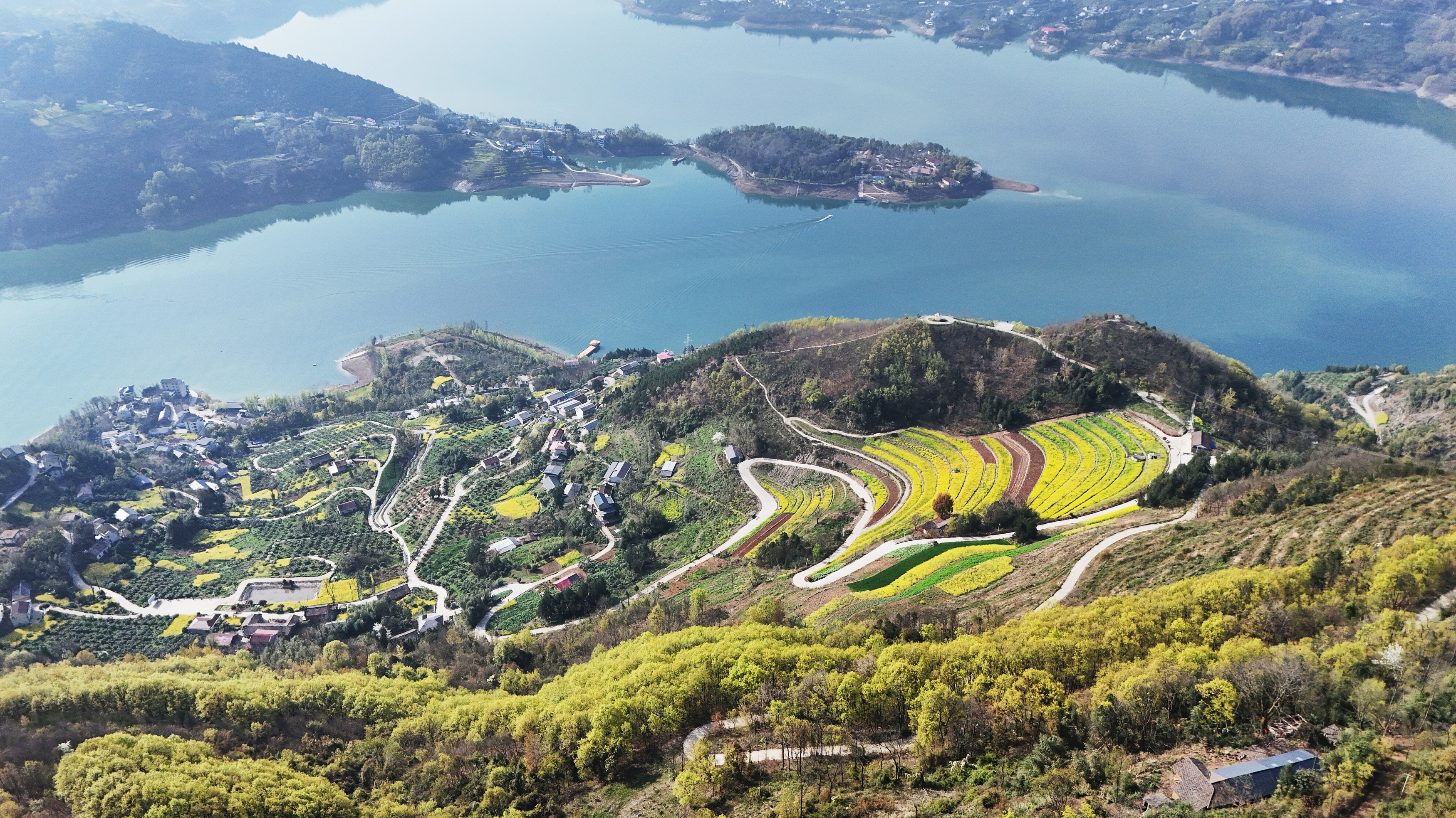 春分過后的漢江安康段沿江兩岸,桃花、櫻花、梨花、李花、油菜花等競(jìng)相綻放,宛如一幅山水畫卷。圖為3月22日拍攝的漢濱區(qū)瀛湖鎮(zhèn)郭家河村春景。 趙華斌 攝