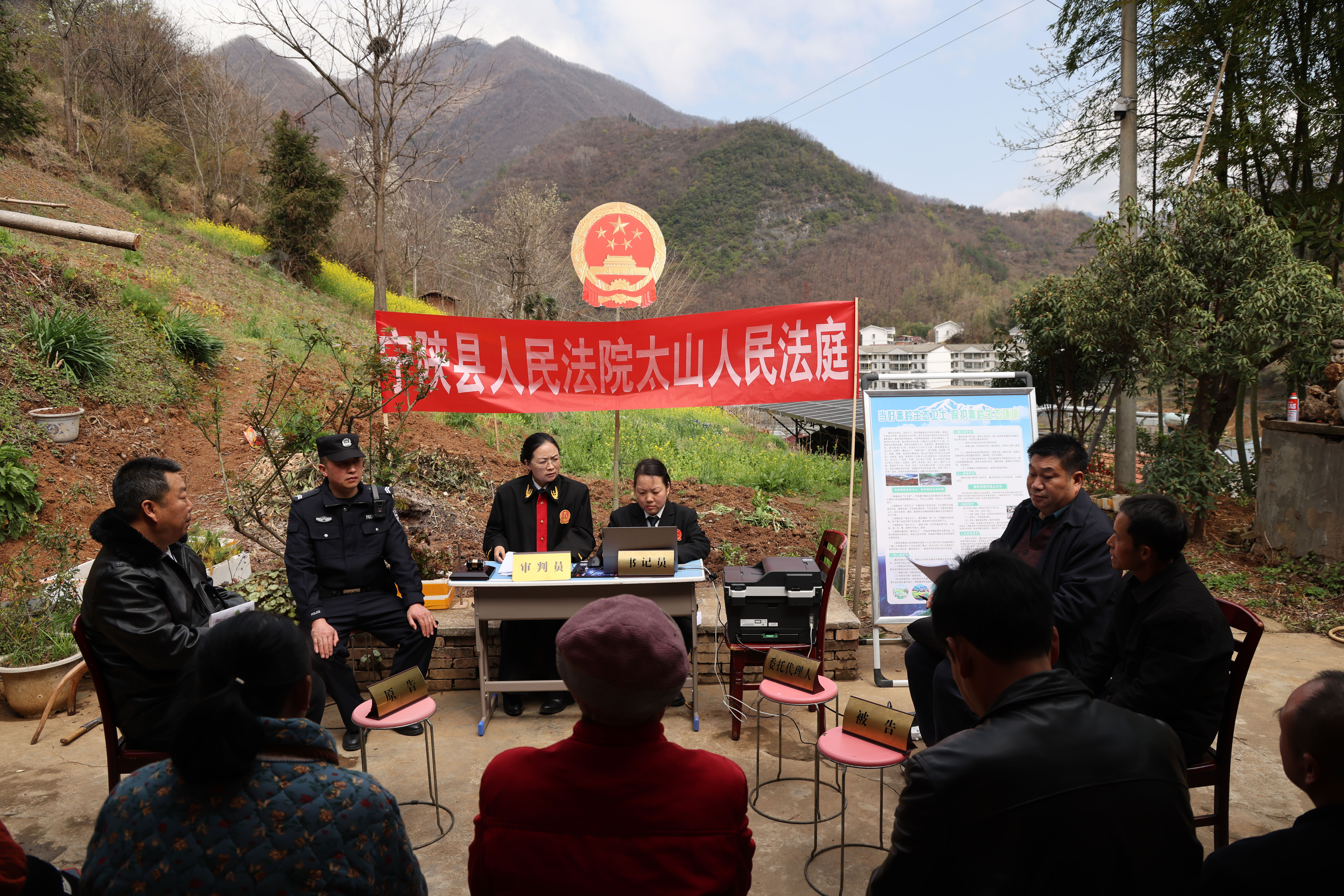 3月24日,在寧陜縣龍王鎮(zhèn)永紅村的田埂旁,金燦燦的花海映襯著莊嚴的國徽更顯熠熠生輝。寧陜縣人民法院就地審理一起排除妨害糾紛案件,成功化解了鄰里之間的多年積怨,真正實現(xiàn)案結、事了、人和。